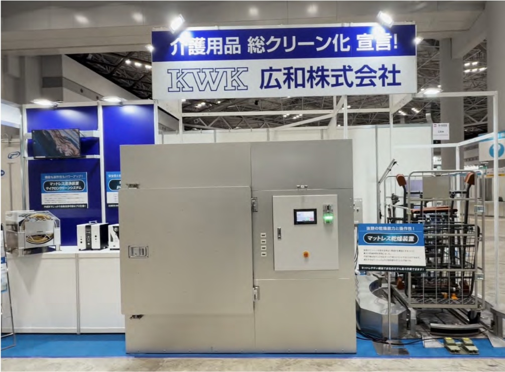 新製品の電気式マットレス乾燥装置をはじめ、カゴ台車回転台、高圧洗浄ロボット、オゾン装置などを出品し、好評の内、展示会を無事に終えることができました。多数ご来場いただき誠にありがとうございました。